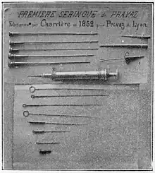 - Le physiologiste lyonnais Charles Gabriel Pravaz perfectionne la seringue, qu'il dote d'une aiguille creuse (1852) et le médecin écossais Alexander Wood développe indépendamment une aiguille hypodermique à Édimbourg[4].