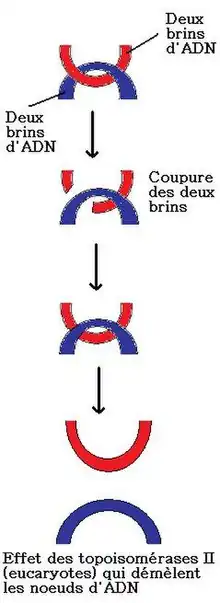 La topoisomérase de type II effectue une coupure temporaire dans la molécule d’ADN pour y faire passer les deux brins de la double hélice (contrairement à la topoisomérase de type I qui n’en fait passer qu’un).