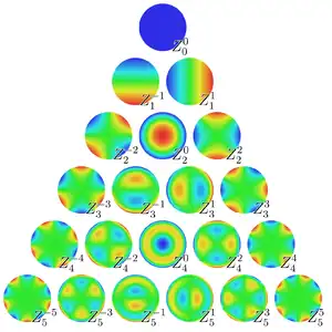 Il existe de nombreuses notations et conventions différentes pour le formalisme de Zernike. Ici, sont données les polynômes orthonormés du cercle de Zernike et aberrations compensées[15].