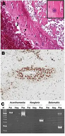 - ↑ C Di Gregorio et Rivasi F, Mongiardo N, De Rienzo B, Wallace S, Visvesvara GS, « Acanthamoeba meningoencephalitis in a patient with acquired immunodeficiency syndrome », Archives of Pathology & Laboratory Medicine, vol. 116, no 12, , p. 1363–5 (PMID 1456885)
