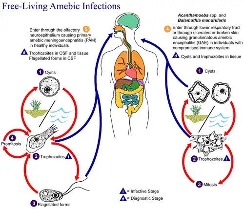 - ↑ (en) FL. Schuster et GS. Visvesvara, « Opportunistic amoebae: challenges in prophylaxis and treatment », Drug resistance updates: reviews and commentaries in antimicrobial and anticancer chemotherapy, vol. 7, no 1, , p. 41–51 (PMID 15072770, DOI 10.1016/j.drup.2004.01.002)