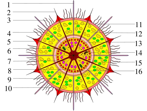 ![]() | 1 - axopode 2 - radicule radiale 3 - filipodes 4 - cortex ectoplasmique 5 - myonème 6 - mithocondrium 7 - endoplasme 8 - ribosome 9 - zooxatelle 10 - vacuoles 11 -microtubules 12 -Ectoplasme 13 -membrane de la capsule centrale 14 - appareil de Golgi 15 - vacuoles digestives 16 - noyaux. |