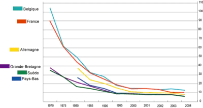 Pour les pays d’Europe du Nord ou de l’Ouest, cette baisse s’est effectuée en deux étapes : 1970-1995 et 1995-2009
