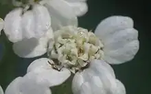 Comme tous les membres de la famille des Astéracées, les « fleurs » sont en fait des capitules de mm de diamètre souvent blanches, roses ou pourpres sur les bords (fleurons ligulés zygomorphes), alors que les fleurons du centre (fleurons tubulés actinomorphes) sont blanc-jaunâtre à jaunes. Ces capitules, qui apparaissent sur les réceptacles inflorescentiels aux sommets des tiges, forment des corymbes au sommet aplati ou un peu bombé[15].