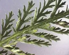 Les feuilles sont allongées, vert foncé, alternes, aux deux faces pubescentes, finement bipennatilobées (doublement pennées), découpées en fines lanières courtes (37 à 51 divisions principales situées sur des plans différents). Elles sont plus longues et pétiolées à la base (avec une base embrassante mais ne formant pas d'oreillette), plus courtes et sessiles au sommet. Elles mesurent de 2 à 15 cm de longueur pour une largeur de 0,6 à cm[12]. Elles dégagent une odeur légèrement camphrée[13].