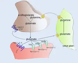 Dans la fente synaptique, le glutamate n'est pas métabolisé. Les molécules qui ne sont pas captées par les récepteurs post-synaptiques sont alors principalement captées par les cellules gliales voisines et métabolisées en glutamine :