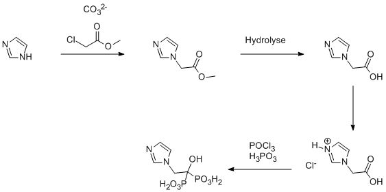 La synthèse de l'acide zolédronique est très complexe et ne peut être réalisée que grâce à deux autres synthèses, réalisée préalablement de celle-ci : celle de l'hydrochlorure de l'acide imidazole-1-yl-acétique et celle de l'imidazole-1-yl-acétate tertiobutylique[2].