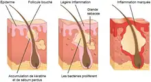Ces lésions, dites « rétentionnelles », peuvent se compliquer d'une inflammation, causée par une bactérie anaérobie de la flore cutanée, Cutibacterium acnes, qui prolifère dans le sébum. Cette maladie souvent chronique est considérée comme nécessitant un traitement d'induction puis un suivi, avec un éventuel traitement d’entretien[1].