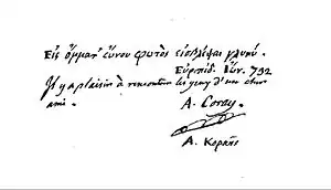- ↑ Lettre du 26 octobre 1795, Κοραῆ 1841, p. 89.