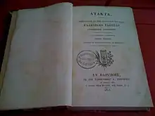 - ↑ Cette brochure avait été publiée à Constantinople en 1798 ; elle était faussement attribuée au patriarche Anthime de Jérusalem ; on sait aujourd'hui qu'elle est très vraisemblablement l'œuvre d'Athanase Parios (en). Voir l'article Coray dans la Biographie universelle, ancienne et moderne, Paris, 1836, Louis-Gabriel Michaud Éditeur, tome LXI, p. 358-375, et Άμαντος 1933, p. 17.