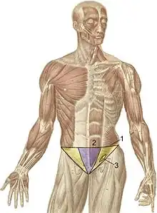 Région inguinale (en jaune avec [3] : canal inguinal) et pubienne (en bleu).