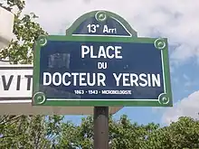 En France, une rue lui est dédiée à Lille ainsi qu'à Bordeaux dans le quartier de la Benauge, à Avignon, à Poitiers, à Dole, à Loos ou encore une impasse aux Sables-d'Olonne (ancienne impasse Claude-Bernard de Château-d'Olonne). On trouve aussi des places, la place du Docteur-Yersin à Paris dans le 13e arrondissement[28] et la place Alexandre-Yersin à Montpellier. Un amphithéâtre de l'Institut de médecine tropicale du service de santé des armées à Marseille, situé à l'entrée du parc du Pharo, portait son nom. À Paris encore, une maison de santé (Paris, 13e), une résidence universitaire[29] et une résidence en autonomie gérée par les Petits Frères des pauvres, portent son nom[30].