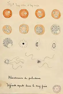 - ↑ Nye, Edwin R (2002). "Alphonse Laveran (1845–1922): discoverer of the malarial parasite and Nobel laureate, 1907". Journal of Medical Biography. 10 (2): 81–7. doi:10.1177/096777200201000205
