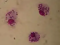 Amastigotes, représentés par les petits points colorés à l'intérieur de la cellule.