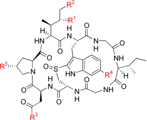 | Amanulline | H | H | NH2 | OH | OH | Ile–Hytrp–Gly–Ile–Gly–Cys–Asn–Hypro | |