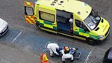 Le , des militaires de l'armée du Royaume-Uni opérant alors en Belgique débarquent, sur un brancard, un blessé d’un camion ambulance qui l'a évacué vers un poste médical avancé.