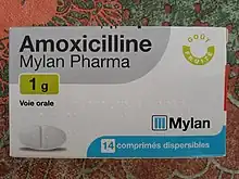 Une boîte d'amoxicilline Mylan 1 g sous forme de comprimés dispersibles.