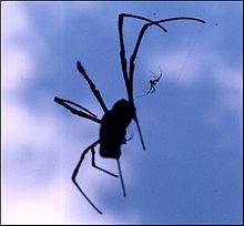 Le dimorphisme sexuel présente chez les araignées une importance considérable, qui s'accompagne parfois d'un cannibalisme sexuel des femelles pour les mâles au moment de la copulation. Les mâles cannibalisés, ou tout au moins leurs restes, demeurent en position de copulation deux fois plus longtemps que les mâles non consommés. Ce suicide copulatoire leur permet ainsi de fertiliser deux fois plus d'œufs et d'augmenter d'autant leur succès reproducteur[64]. Il existe même un cannibalisme précopulatoire de la part des femelles, qui se révèlent par cet apport de ressources nutritives spécifiques, plus attractives et enclines que les autres à protéger leurs œufs dans une oothèque, tandis que le taux d'éclosion est plus élevé[65]. Ce cannibalisme avant l'insémination de sperme s'interprète dans le cadre de la théorie du conflit sexuel[66].