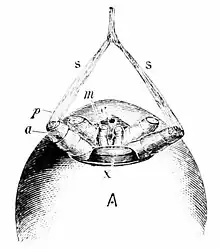 - ↑ Appelée aussi fovea media, cette dépression transverse ou longitudinale suivant les familles correspond au point où s'insère le puissant muscle dilatateur dorsal du jabot aspirateur.