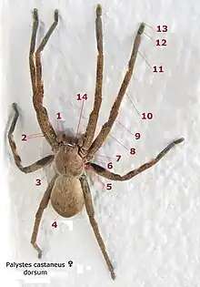 Articles des pattes. 6 : hanche ou coxa ; 7 : trochanter ; 8 : fémur ; 9 : patella ; 10 : tibia ; 11 : métatarse ou basitarse ; 12 : tarse ; 13 : griffes ; 14 : chélicère.