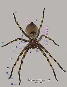 Chaque patte ambulatoire se compose de 7 articles : de la base vers l'apex respectivement, on observe une hanche (coxa), un trochanter court et peu mobile, un long fémur (le trochanter et le fémur forment l'analogue d'une cuisse), une plus courte patella, un long tibia (patella et tibia formant la jambe), un métatarse et un tarse. Ce dernier est prolongé par un segment apical appelé prétarse[14] dont l'extrémité, chez les araignées tisserandes, porte 2 ou 3 griffes souvent denticulées à la face inférieure, lesquelles interviennent dans la manipulation de la soie et dans le déplacement sur la toile. Sont associées aux pattes diverses structures liées au mode de vie particulier de chaque taxon, que ce soient des peignes pour « carder » la soie, des épines, crins, poils qui servent d'organes sensoriels, des structures de stridulation. Chez certaines Araignées, qui ont les pattes longues et grêles, le tarse est rendu flexible[15].