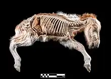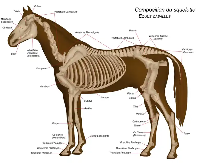 Le squelette est composé de 206 os et représente environ 8 % de la masse du cheval. Il supporte les parties molles du corps, joue le rôle de structure et protège les organes vitaux. La colonne vertébrale se compose de 54 os tandis que la boîte crânienne en possède 34. Le cheval a 18 paires de côtes. Contrairement à l'homme, le cheval n'a pas de clavicule, un trait commun à la plupart des ongulés, dont les mouvements des membres antérieurs sont limités sur le côté[1].