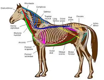 Le cheval dispose de plus de 480 muscles ce qui représentent environ 60% de son poids[3]. Les muscles sont constitués d'un ensemble de fibres. Ces fibres agissent par contraction ou par extension. Les muscles sont reliés aux os soit directement, soit par l'intermédiaire des tendons. Ils permettent le mouvement du cheval, en agissant sur le mouvement de la plupart des os entre eux.