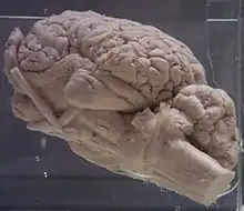 - L’encéphale est toute la partie du système nerveux central protégé dans la boite crânienne : des hémisphères cérébraux, et le cervelet. Il pèse environ 500 g, soit 0,12 % de la masse du cheval (contre 2,33 % chez l’homme). Le coefficient d’encéphalisation, qui fournit une indication sur le volume du cerveau apte à développer des fonctions cognitives (apprentissage, développement), est de 0,07 chez le cheval. À titre de comparaison, il est de 0,71 chez l’homme.