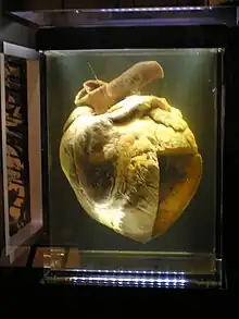 Le cœur, muscle viscéral strié, pèse de 3 à 5 kg chez un cheval de 500 kg. La masse musculaire dépend de son entraînement. Il mesure 26 cm environ de diamètre[c 2]. Sa fréquence cardiaque est de 28 à 40 battements par minute au repos, à 220 battements lors de grands efforts. Un cheval au repos ayant une fréquence cardiaque supérieure à 50 battements par minute traduit une souffrance de l'animal[9]. Le cœur est situé dans la partie antérieure de la poitrine, recouvert en partie par les poumons. Un échancrure du poumon gauche lui permet de quasiment toucher la paroi thoracique de ce côté[c 3]. Le cœur comporte quatre cavités: