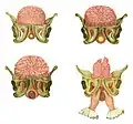 « représentait le bassin d'une femme, la matrice, son orifice, ses ligaments, le conduit appelé vagin, la vessie, et l'intestin rectum. J'y joignis un modèle d'enfant de grandeur naturelle, dont je rendis les jointures assez flexibles pour pouvoir les mettre dans des positions différentes[,] un arrière-faix[17], avec les membranes, et la démonstration des eaux qu'elles renferment, le cordon ombilical, composé de ses deux artères, et de la veine, laissant une moitié flétrie, et l'autre gonflée, pour imiter en quelque sorte le cordon d'un enfant mort, et celui d'un enfant vivant, auquel on sent les battements des vaisseaux qui le composent. J'ajoutai le modèle de la tête d'un enfant séparée du tronc, dont les os du crâne passaient les uns sur les autres[18]. »