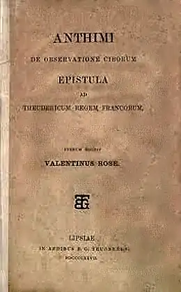 De Observatione Ciborum est un petit traité (opuscule) de diététique, dont le titre exact est Epistula Anthimi ad gloriosissimum Theodoricum regem Francorum[5]. Organisé en 91 chapitres consacrés à 94 aliments, l'ouvrage attribue à chaque aliment des critères médicaux et de digestibilité, avec des conseils culinaires et de nombreuses recettes de cuisine[1],[4],[6].