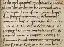 « (...) et ajouter du miel dans une quantité égale à la moitié de celle du vinaigre ou suivant la saveur sucrée que l'on veut obtenir. Faire cuire à feu doux en agitant fréquemment la marmite avec les mains pour que le jus pénètre bien la viande. Piler 50 [chiffre incertain] grains de poivre, du costum et des têtes de nard, pour chacun autant que la moitié du poids d'un ducat, et du girofle du poids d'un tremissis. Ces éléments seront pilés ensemble dans un mortier d'argile, en ajoutant un peu de vin, et quand tout sera bien mélangé, mettre dans la marmite...»