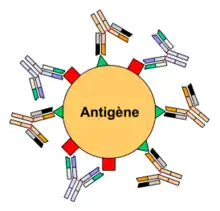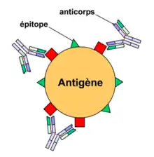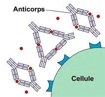 Un anticorps est un complexe protéique produit par le système immunitaire adaptatif dans un organisme vivant pour détecter et neutraliser les agents pathogènes de manière spécifique. Ce faisant, les anticorps se lient à l'agent pathogène et dirigent vers lui, dans le but de le détruire, les cellules immunitaires dites phagocytes (macrophages, polynucléaires neutrophiles) et/ou les agents du complément. L'organisme devient alors réfractaire à l’agent envahisseur : il s’immunise[1].