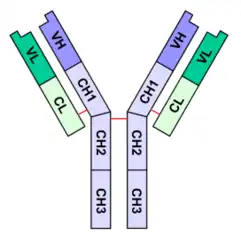 En bleu, Chaîne lourde avec une région variable (VH) suivie d'une région constante (CH1), une région charnière, et deux autres régions constantes (CH2 and CH3).