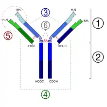 3. Chaîne lourde (en bleu) avec une région variable (VH) suivie d'une région constante (CH1), une région charnière, et deux autres régions constantes (CH2 and CH3).
