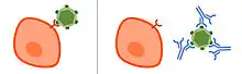 Afin de réussir à s'introduire dans les cellules, les particules virales et les bactéries intracellulaires se servent des molécules qui se trouvent à leurs surfaces dans le but d'interagir avec les récepteurs de surface cellulaire de leur cellule cible. Cela leur permet d'entrer dans la cellule et d'entamer leur cycle de réplication[3].Les anticorps neutralisants peuvent refréner la capacité d'infection en se liant à l'agent pathogène et en bloquant les molécules qui sont nécessaires pour entrer dans les cellules. Cela peut être causé par les anticorps interférant statiquement avec les agents pathogènes, ou bien par les toxines se fixant aux récepteurs des cellules hôtes. Lors d'une infection virale, les anticorps neutralisants peuvent se lier aux glycoprotéines de virus enveloppés ou aux protéines de capside de virus non enveloppés. De plus, les anticorps neutralisants empêchent les particules de subir des changements structurels qui sont souvent nécessaires pour que l'entrée cellulaire soit réussie. Par exemple, les anticorps neutralisants peuvent empêcher les changements conformationnels des protéines virales qui assurent la médiation de la fusion membranaire nécessaire à l'entrée dans la cellule hôte. Dans certains cas, le virus est incapable de causer une infection, même après la dissociation de l'anticorps. Le complexe pathogène-anticorps est finalement absorbé et dégradé par les macrophages [4].
