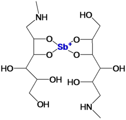 L'antimoniate de méglumine est un médicament utilisé pour le traitement de la leishmaniose[2] contenant de l'antimoine(V). Sa structure chimique demeure ambiguë, avec une formule chimique généralement écrite C7H18N1O8Sb (anhydre) ou C7H20N1O9Sb (monohydrate). On pense que l'espèce chimique prépondérante en solution est un complexe de deux molécules de méglumine avec un cation d'antimoine Sb5+.