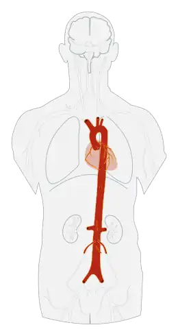 Chez les mammifères, l’aorte (du latin tardif aorta, du grec ἀορτή / aortḗ, les deux termes aorte et artère renvoyant au grec ἀείρω / aeírō, « lever, soulever, enlever » et faisant référence initialement aux bronches[1]) est la plus grande et la plus grosse artère de l'organisme. Elle naît du ventricule gauche du cœur et elle s'étend jusqu'à l'abdomen, où elle bifurque en deux artères plus petites (les artères iliaques communes). Elle apporte notamment du sang oxygéné à toutes les parties du corps via la circulation, excepté à la circulation fonctionnelle du poumon (artère pulmonaire).