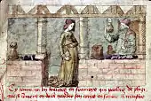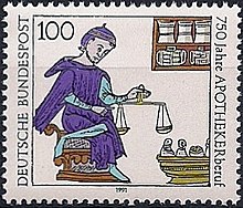 Des communautés d'apothicaires se constituèrent. Elles sont à l'origine du caractère réglementé que la pharmacie conserve aujourd'hui. À l'origine, ces communautés se distinguaient mal de celle des médecins jusqu'à l'édit de Salerne (de) édicté par Frédéric II en 1241, édit qui sépare juridiquement les deux corporations et marque l'acte de naissance de la profession d'apothicaire[9],[8]. Cet édit servant de modèle en Occident mettra cependant plusieurs siècles à devenir effectif, comme le montre la corporation Arte dei Medici e Speziali.