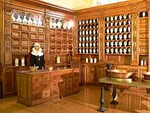 L’apothicairerie, comme celle de Besançon, disposait généralement d'un comptoir en bois, de commodes avec tiroirs d'apothicaire (tiroirs pourvus de poignées en cuivre et d'étiquettes, réservés aux simples) et de rayonnages présentant des bocaux, burettes à anche et chevrettes pour les sirops, pots en faïence avec des étiquettes peintes, silènes en bois peint. Sur les poutres de la boutique pouvaient être suspendus lézards empaillés, œufs d’autruche, serpents. Dans la salle de préparation, l'apothicaire utilisait principalement une balance avec scrupule (système de mesure du fluide scrupule) et une balance à trébuchet, des seringues (pour l'administration des clystères) et canules, des pistons de rechange, des moules à pilules, le mortier et pilon, des bassines, chaudrons et alambics préparant les eaux distillées[16].