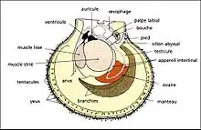 Le prolongement de ce manteau forme un compartiment rempli d'eau, appelé cavité palléale, dans lequel se trouvent les branchies, l'anus et les pores excréteurs. La cavité palléale a un rôle important : la circulation permanente de l'eau. Cette circulation permet d'apporter de l'O2 aux branchies et d'éliminer tous les déchets. Quand l'eau transporte l'O2 et la nourriture, l'eau pénètre dans la cavité palléale par une ouverture appelée siphon inhalant. Après être passée au-dessus des branchies, l'eau transporte maintenant le CO2 et les déchets qui cette fois-ci ressorte par le siphon exhalant.