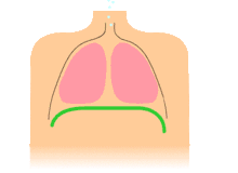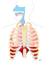 Un grand muscle en forme de coupole, le diaphragme, délimite la cage thoracique vers le bas. Lors de l'inspiration, ce muscle se contracte, descend vers le bas et agrandit ainsi le volume de la cage thoracique. Les poumons se distendent et augmentent, y aspirant de l'air venant de l'extérieur. Lors de l'expiration, le diaphragme se relâche, les poumons reprennent leur forme normale, tirant le diaphragme vers le haut et chassant l'air vers l’extérieur.