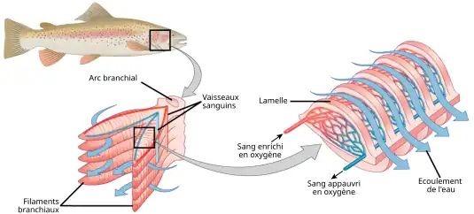 Dans le cas des poissons, deux branchies sont positionnées de chaque côté de la tête. Elles sont internes et protégées, pour les poissons osseux, par une plaque dure, l'opercule. Chaque branchie est composée normalement de 5 paires d'arcs branchiaux sur lesquels sont attachés les filaments qui sont composés de lamelles où s'effectue l'échange gazeux. Le nombre de ces lamelles se compte en millions[18].