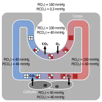 Dans le sang vers les cellules : à cause du phénomène de la diffusion, les pressions partielles des gaz s'équilibrent. Les pressions partielles des différents gaz dans le sang à la sortie des poumons sont donc égales aux pressions dans les alvéoles, c'est-à-dire P(O2) = 100 mmHg et P(CO2) = 40 mmHg. L'azote est aussi dissout dans le sang, mais dans une proportion très faible[11].