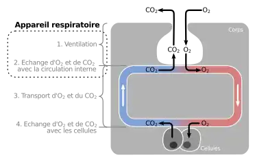 Au niveau des cellules : les cellules consomment continuellement de l'O2 et produisent du CO2. L'O2 va donc diffuser dans la cellule et le CO2 vers le sang[10].