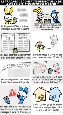 Au 7 avril 2020, plus d'une douzaine de groupes d'experts travaillent sur des solutions visant à respecter au maximum la vie privée, telles que l'utilisation de Bluetooth à basse consommation (BLE) pour enregistrer la proximité d'un utilisateur avec d'autres téléphones portables. Les utilisateurs reçoivent un message s'ils ont été en contact proche avec quelqu'un qui a été testé positif à la Covid-19[11].