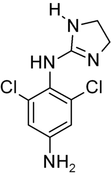 L'apraclonidine est une imidazoline dont la formation chimique est 2-amino 4,5-dihydro-1H-imidazoline, dans laquelle l'un des hydrogènes aminés exocycliques a été remplacé par un groupe 4-amino-2,6-dichlorophényle. Il a un rôle d'agoniste alpha-adrénergique. C'est un membre des imidazolines, un dichlorobenzène et un membre des guanidines. C'est une base conjuguée d'une apraclonidine(1+).