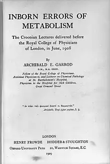 En 1908, dans son premier ouvrage Inborn errors of metabolism, Archibald Garrod étend son concept d'erreur innée du métabolisme à d'autres maladies : l'albinisme, la cystinurie, la pentosurie (en) et la porphyrie. La nature de ces maladies est congénitale et métabolique[1],[3].