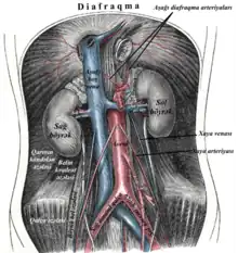 Relation entre des viscères et des gros vaisseaux de l'abdomen sur une vue postérieure. (L'artère sacrale médiane visible au centre en bas de l'illustration.)