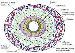 - la tunique moyenne constituée de une à trois couches de cellules musculaires disposées circulairement accompagnées de fibres élastiques,